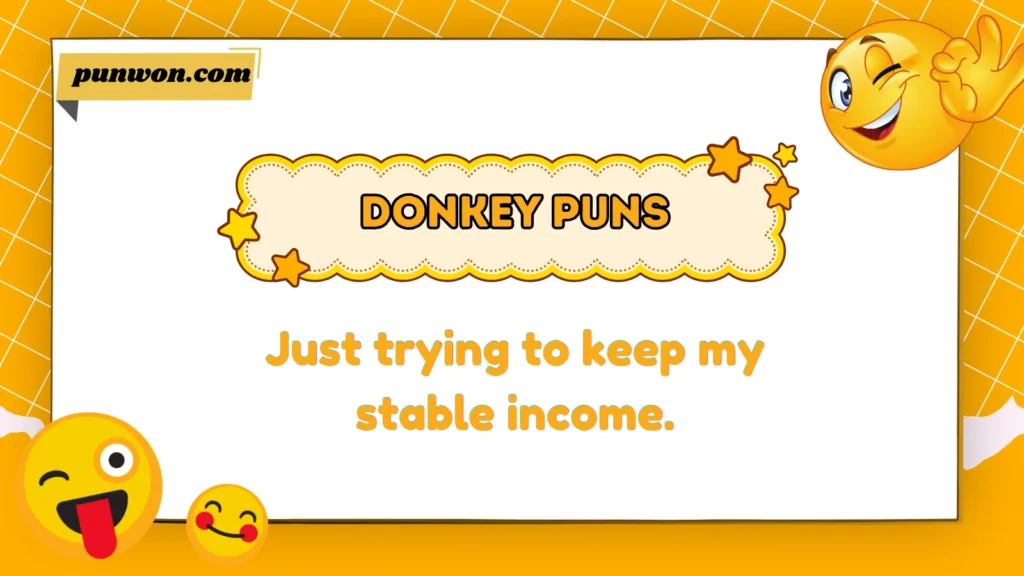 Funny donkey puns include wordplay with bray, hay, hoof, mule, and stable. Examples like “un-bray-lievable” and “stable income” are crowd favorites.